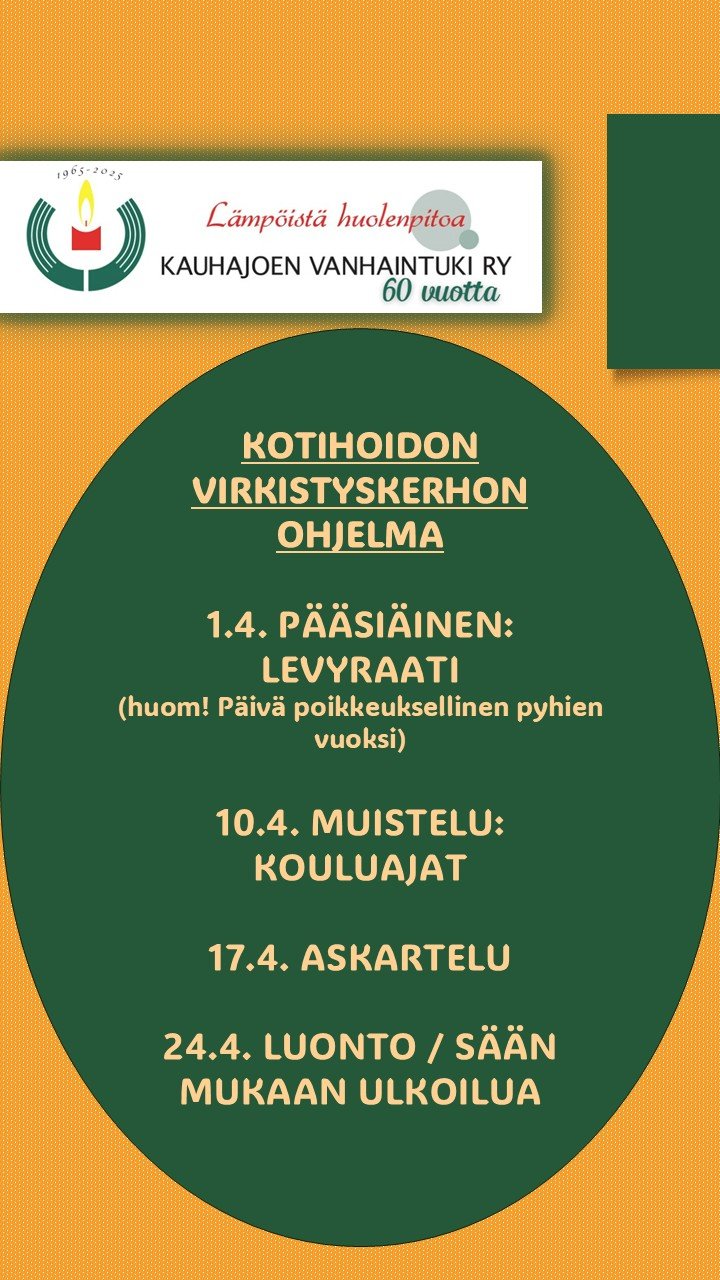 Ohjaajana toimii kotihoidon hoitaja Tiina Hakanen. Ohjelmassa muun muassa ulkoilua, kuntouttavaa toimintaa, bingoa, askartelua ym. erillisen ohjelman mukaisesti. Vaihtuva ohjelma päivitetään sivuille kerran kuukaudessa.
