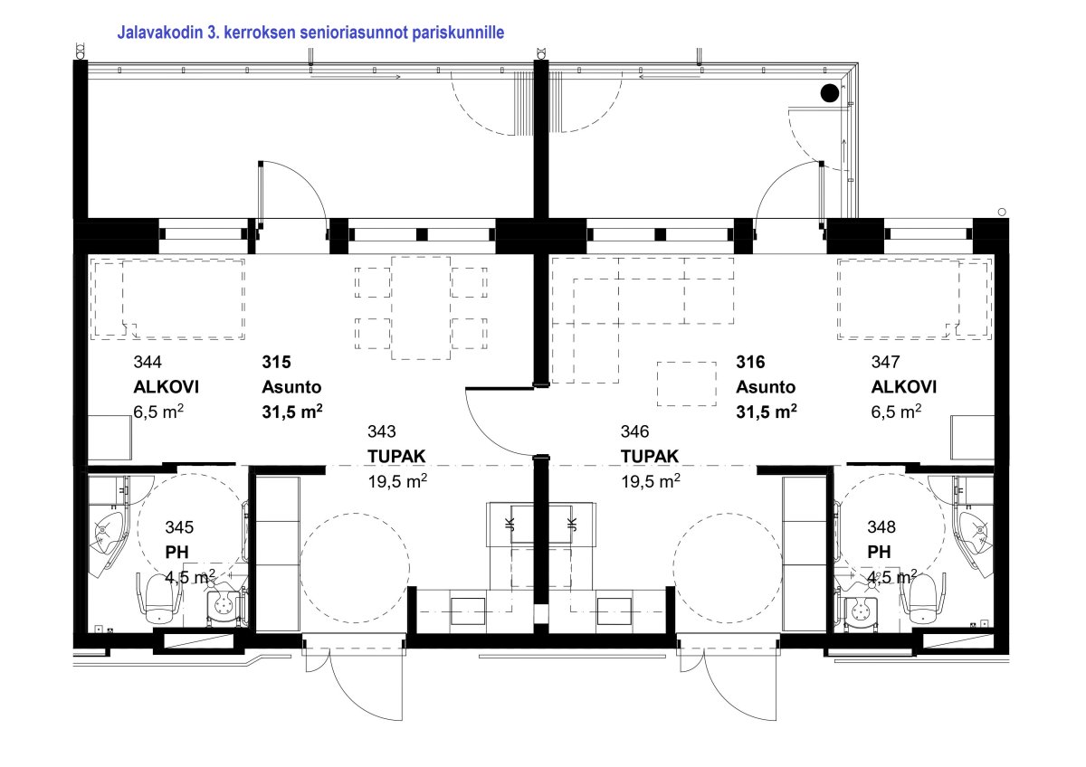 Kolmannessa kerroksessa on 24 senioriasuntoa, kooltaan 30 m2, 32 m2 ja 45 m2, jossa on erillinen makuuhuone. Viisi asuntoa on varustettu väliovella viereiseen asuntoon, joka mahdollistaa esim. pariskunnan asumisen yhdessä ja halutessaan voi kuitenkin nauttia omasta rauhasta oman asunnon puolella. Kaikissa asunnoissa on tupakeittiö, alkovi,  ph/wc, lisäksi 23:ssa asunnossa on lasitettu parveke.
